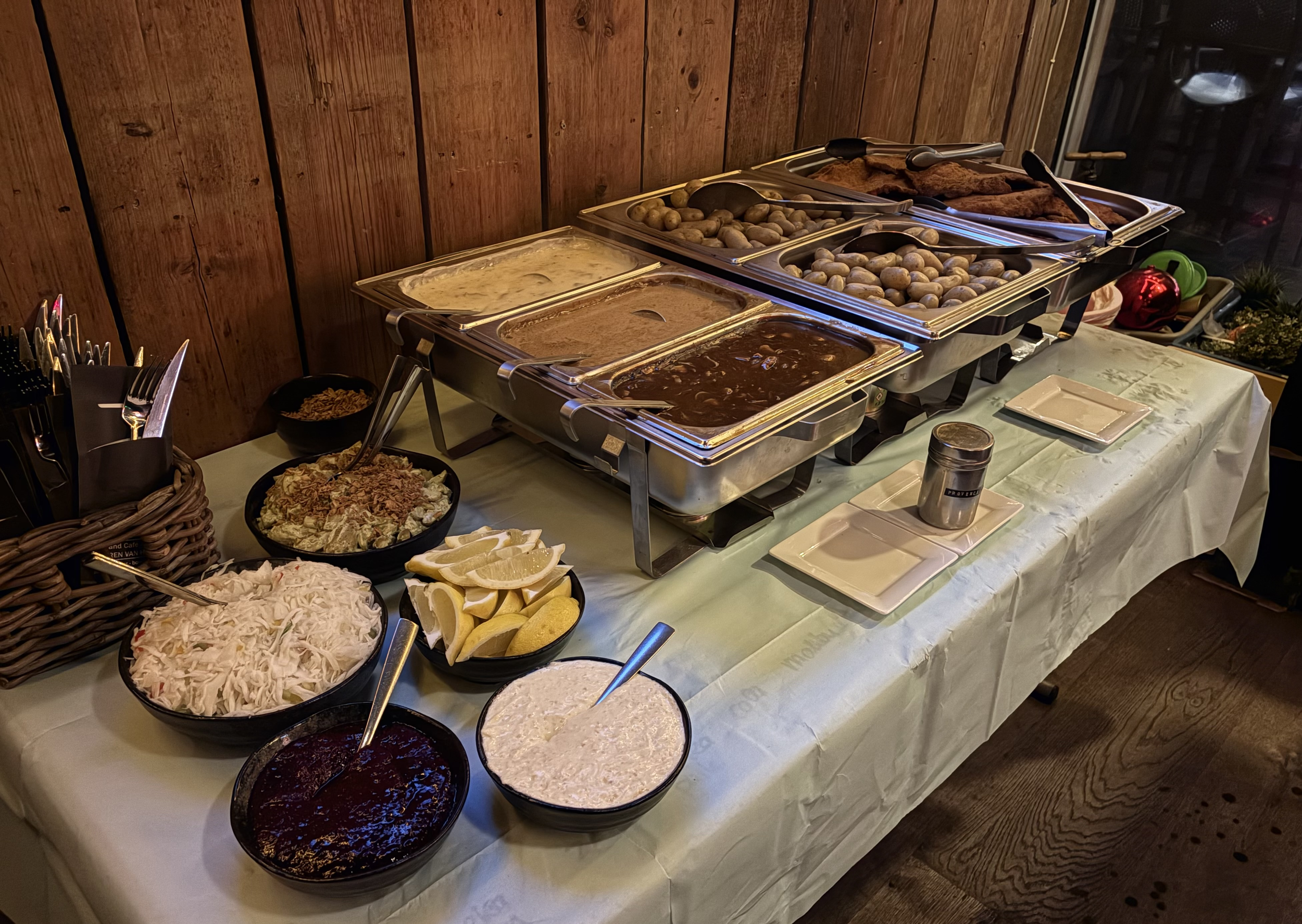 Op locatie of op onze eerste verdieping, danwel exclusief op onze begane grond: een compleet schnitzelbuffet met onze (warme) huisgemaakte sauzen, aardappel- en zoetzure witte koolsalade, desgewenst aangevuld met onze curryworst, huisgemaakte currysaus en gefrituurde uitjes en/of de warme apfelstrudel met vanillesaus als nagerecht.