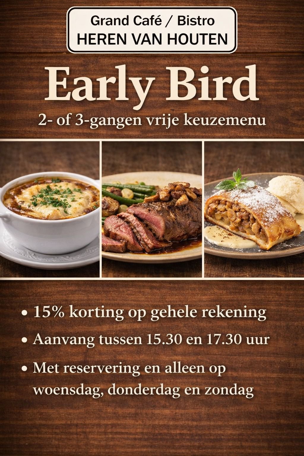 Ga je bijvoorbeeld begin van de avond naar de film of heb je ‘s avonds nog een vergadering, maar wil je toch even rustig dineren? Denk dan aan ons “Early Bird”-arrangement.